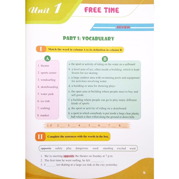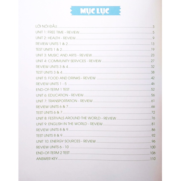 - Phần 1: Unit Review and Tests (Các đề ôn tập và bài kiểm tra). Các đề ôn tập trong phần này sẽ được trình bày dưới dạng các bài luyện tập theo từng unit (Unit Review). Sau mỗi 2 bài học (unit) và cuối mỗi học kỳ sẽ có một bài kiểm tra (Test) tương ứng để học sinh có thể tự kiểm tra.
